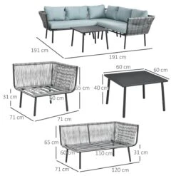 Si quieres darle un aire nuevo a tu jardín o crear por primera vez una zona de relax en la terraza de casa, no puedes dejar pasar este conjunto de ratán de Outsunny. Cuenta con un sofá de esquina compuesto de 3 módulos con espacio suficiente para que se sienten cómodamente 5 personas y una mesa de centro. Con estructura resistente de acero y cubierto de ratán PE ofrece una apariencia elegante, moderna y confortable. Un conjunto bonito, cómodo y muy funcional. Características – Conjunto de jardín compuesto por un sofá esquinero de 3 módulos y una mesita de centro – Forma compacta en L, ideal para espacios de esquina en tu jardín, terraza o balcón – Fabricado con marco de aluminio ligero, tela de larga duración y ratán PE redondo tejido a mano – Tapa de chapa de aluminio con pintura especial para mayor durabilidad y facilidad de limpieza – Cojín de asiento y respaldo de apoyo para garantizar un buen descanso y comodidad – Fundas de cojines con cremallera para facilitar su limpieza – Ideal para espacios al aire libre como patios, terrazas o jardines – Se requiere montaje Especificaciones – Color: negro, gris – Material: aluminio, ratán PE, poliéster – Medidas de sofá doble: 120x71x65 cm (LxANxAL – Medidas de asiento del sofá doble: 110×60 cm (LxAN – Medidas de sofá de esquina: 71x71x65 cm (LxANxAL – Medidas de asiento del sofá de esquina: 60×60 cm (LxAN – Medidas de mesa de centro: 60x60x40 cm (LxANxAL – Altura de los asientos: 31 cm (sin cojín – Carga máxima: 240 kg (sofá doble, 120 kg (sofá individual, 30 kg (mesa – Referencia: 860-275V00GY