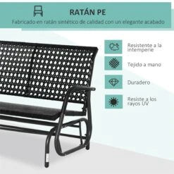 - – BALANCÍN BIPLAZA PARA EXTERIOR: Resistente a la intemperie es ideal para tu jardín, terraza o patio. Dondequiera que la instales y coloques, dará un toque cómodo, elegante y a la vez divertido – ESTRUCTURA RESISTENTE: Este banco de dos plazas con basculación cuenta con una estructura de acero con recubrimiento en polvo para mayor resistencia, y con acabado de mimbre de ratán PE que le aporta un toque distintivo y elegante – BASCULACIÓN SUAVE: Este banco balancín para exteriores de diseño 2 en 1 cuenta con brazos oscilantes conectados al asiento que proporciona un balanceo suave hacia adelante y hacia atrás sin ruido – MÁXIMA COMODIDAD: Este banco para jardín basculante tiene un diseño ergonómico con asiento extra ancho, respaldo curvo y reposabrazos a cada lado para mayor comodidad y relajación – MEDIDAS TOTALES: 120x70x84 cm (LxANxAL. Medidas del asiento: 115×47 cm (LxAN. Certificaciones: EN581-1-2. Peso máximo soportado: 220 kg