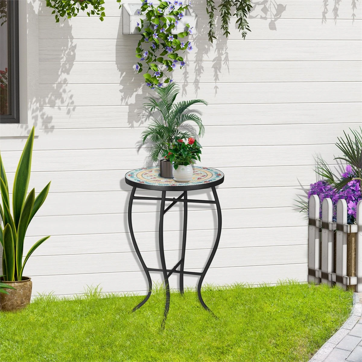 ¿Estás preparando tu terraza o jardín para la llegada del buen tiempo? Entonces esta mesa con mosaico de jardín de Outsunny seguro que te encantará. La mesa cuenta con una bonita estructura metálica con patas curvas y una encimera con un grabado colorido tipo mosaico. Es tan bonita que, aunque esté diseñada para estar a la intemperie, podrás usarla también en el salón, como mesita de noche o en otros espacios interiores de tu casa. Incluso usarla como soporte para tus plantas.