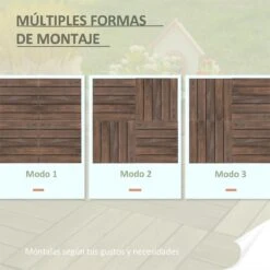 ¿Necesitas embaldosar una zona de tu terraza o jardín y no quieres recurrir a costosas obras? El set de 27 baldosas de Outsunny son la solución perfecta para cubrir una zona de 2,43 metros cuadrados. Cada loseta mide 30 cm por costado y pueden juntarse entre sí mediante un simple sistema de clic. Hechas en madera maciza texturizada y anclaje de PVC, ofrece una superficie antideslizante para andar cómodamente sobre ella incluso cuando están mojadas por lluvia o el agua de tu piscina. Características – Losetas hechas de madera maciza y PVC de alta calidad – Resistentes a la intemperie – Aptas para colocación en múltiples espacios como terrazas, pasillos, piscinas, etc. – Sistema de clic, se acoplan unas con otras y se pueden montar según tus necesidades y zona a cubrir – Instalación fácil y rápida, juntando mediante sistema de encaje unas losetas con otras – Fácil de montar con el diseño de broche de enclavamiento – Set de 27 piezas, para cubrir una superficie de 2,43 m² Especificaciones – Color: marrón oscuro (cedro manchado – Material: madera de cedro y PVC – Medidas totales (de una sola pieza: 30x30x2,5 cm (LxANxAL – Número de baldosas: 27 piezas – Área de cobertura: 2,43 m² – Referencia: 844-325BK