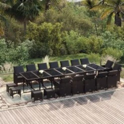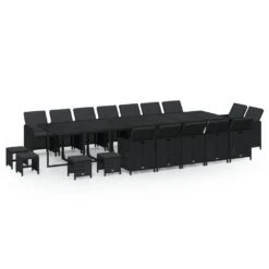 Este juego de comedor para jardín de ratán sintético, con un diseño elegante y único, es una excelente opción para cenar y relajarte en el espacio al aire libre de la casa. Material práctico: Envuelto en ratán PE resistente a la intemperie, este juego de comedor para jardín es fácil de limpiar y resistente, y brinda años de relajación de calidad.Estructura estable y fuerte: Las estructuras de acero de la mesa y las sillas de jardín garantizan su robustez y estabilidad.Sillas flexibles: Puedes tirar de los respaldos hacia abajo y guardar las sillas de exteriores debajo de la mesa, lo que ahorra un valioso espacio de almacenamiento cuando el set no se use. Gracias a su construcción ligera , todos los artículos son fáciles de mover.Experiencia cómoda: El asiento y los cojines traseros gruesos, suaves y rellenos de espuma también añaden comodidad a los asientos. Nota:Para prolongar la vida de tus muebles de exterior, te recomendamos que los protejas con una funda impermeable. Mesa:Color: NegroMaterial: Ratán PE, acero con recubrimiento en polvo, vidrio templadoDimensiones de la mesa: 387 x 107 x 74 cm (largo x ancho x altoGrosor del vidrio: 5 mmSilla:Color de ratán sintético: NegroColor del cojín: NegroMaterial: Ratán PE, acero con recubrimiento en polvo, tela (100% poliésterDimensiones de la silla: 52 x 56 x 85 cm (ancho x profundo x alto Dimensiones del cojín del asiento/respaldo: 46 x 41 x 5 cm (ancho x profundo x grosorDimensiones de asiento: 46 x 41 cm (ancho x profundoAltura del asiento desde el suelo: 45 cmAltura del reposabrazos desde el suelo: 64 cmTaburete:Color de ratán sintético: NegroColor del cojín: NegroMaterial: Ratán PE, acero con recubrimiento en polvo, tela (100% poliésterDimensiones del taburete: 40,5 x 40,5 x 35 cm (ancho x profundo x altoGrosor del cojín del asiento del sofá: 5 cmRequiere montaje: SíLa entrega incluye:1 x Mesa14 x Sillas4 x Taburete18 x Cojines de asiento14 x Cojines de respaldo