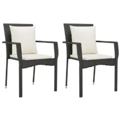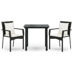 Este moderno juego de comedor de jardín, con un diseño elegante y contemporáneo, es una excelente opción para comer o relajarse en el jardín. Material resistente a la intemperie: El ratán PE, también conocido como ratán sintético, es resistente a la intemperie y fácil de limpiar. La parte exterior se mantiene hermosa durante mucho tiempo. Ofrece una gran calidad, comodidad y aspecto estético.Estructura robusta: Las estructuras de acero con recubrimiento en polvo hacen que el juego de comedor para exterior sea resistente y estable para usar a diario al aire libre.Superficie práctica: La superficie de madera maciza de acacia es perfecta para colocar bebidas, comida y adornos. Es bonita y fácil de limpiar.Diseño modular: El juego de comedor para patio es flexible y fácil de mover, por lo que puedes combinarlo con otros segmentos modulares de la web para crear tus propias configuraciones personales de muebles de comedor para jardín.Cómodo asiento: El respaldo añade un plus de comodidad al asiento de la silla de jardín. Además, los cojines gruesos y acolchados proporcionan comodidad al asiento. Información útil:Para facilitar al máximo el montaje, cada producto se entrega con un manual. Nota:Para asegurarte de que tus muebles de exterior se mantengan hermosos, recomendamos protegerlos con una funda impermeable. Color: NegroColor de cojines: Blanco cremaSilla de jardín:Material: Ratán PE, acero con recubrimiento en polvoMaterial de la funda del cojín: Tela (100% poliésterDimensiones: 59 x 53,5 x 88 cm (ancho x profundo x altoDimensiones de asiento: 43 x 43 cm (ancho x profundoAltura del asiento desde el suelo: 44 cmAltura del apoyabrazos desde el suelo: 64,5 cmAnchura del reposabrazos: 6 cmDimensiones del cojín de respaldo: 37 x 37 x 10 cm (ancho x profundo x grosorDimensiones del cojín de asiento: 40 x 43 x 3 cm (ancho x profundo x grosorMesa:Material: Ratán PE, acero con recubrimiento en polvo, madera maciza de acacia con acabado de aceiteDimensiones: 80 x 80 x 74 cm (ancho x profundo x altoLa entrega incluye:2 x Sillas de jardín2 x Cojines de respaldo2 x Cojines de asiento1 x Mesa