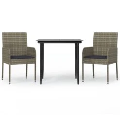 Este moderno juego de comedor de jardín, con un diseño elegante y contemporáneo, es una excelente opción para comer o relajarse en el jardín. Material resistente a la intemperie: El ratán PE, también conocido como ratán sintético, es resistente a la intemperie y fácil de limpiar. La parte exterior se mantiene hermosa durante mucho tiempo. Ofrece una gran calidad, comodidad y aspecto estético.Estructura robusta: Las estructuras de acero con recubrimiento en polvo hacen que el juego de comedor para exterior sea resistente y estable para usar a diario al aire libre.Superficie práctica: La superficie de madera maciza de acacia es perfecta para colocar bebidas, comida y adornos. Es bonita y fácil de limpiar.Diseño modular: El juego de comedor para patio es flexible y fácil de mover, por lo que puedes combinarlo con otros segmentos modulares de la web para crear tus propias configuraciones personales de muebles de comedor para jardín.Cómodo asiento: El respaldo añade un plus de comodidad al asiento de la silla de jardín. Además, los cojines gruesos y acolchados proporcionan comodidad al asiento. Información útil:Para facilitar al máximo el montaje, cada producto se entrega con un manual. Nota:Para asegurarte de que tus muebles de exterior se mantengan hermosos, recomendamos protegerlos con una funda impermeable. Color: Negro y grisColor de cojín: Gris oscuroSilla de jardín:Material: Ratán PE, acero con recubrimiento en polvoMaterial de la funda del cojín: Tela (100% poliésterDimensiones: 48 x 55 x 88 cm (ancho x profundo x altoDimensiones de asiento: 43 x 45 cm (ancho x profundoAltura del asiento desde el suelo: 43 cmAltura del reposabrazos desde el suelo: 60,5 cmDimensiones del cojín de asiento: 43 x 45 x 3 cm (ancho x profundo x grosorMesa:Material: Acero con recubrimiento en polvo, madera maciza de acacia con acabado de aceiteDimensiones: 80 x 80 x 74 cm (largo x ancho x altoLa entrega incluye:2 x Sillas de jardín2 x Cojines de asiento1 x Mesa