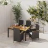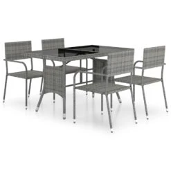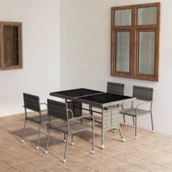 ¡Crea una estética atractiva y cohesionada en el espacio al aire libre de tu casa con este juego de comedor para jardín de ratán sintético! La mesa y las sillas de comedor están hecha de ratán sintético de bajo mantenimiento, por lo que son fáciles de limpiar con un paño húmedo y también son perfectas para usar al aire libre. Gracias a la estructuras de acero, la mesa y las sillas son estables y seguras. La superficie de vidrio también da un toque lujoso al espacio exterior de tu casa. Además, estas sillas de exterior son ligeras y se pueden apilar para ahorrar espacio cuando no se usen. Ten en cuenta que recomendamos cubrir el set de comedor en caso de lluvia, nieve y heladas para que sea más duradero. Mesa:Color: GrisMaterial: Ratán PE, acero con recubrimiento en polvoMaterial de la superficie: VidrioDimensiones de la mesa: 140 x 80 x 74 cm (largo x ancho x altoFácil de limpiarSilla:Color: Gris antracitaMaterial: Ratán PE, acero Dimensiones de las sillas: 51 x 60 x 87 cm (ancho x profundo x altoAnchura del asiento: 48 cmAltura del asiento desde el suelo: 42 cmRequiere montaje: SíLa entrega incluye:1 x Mesa4 x Sillas