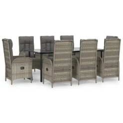 Este moderno juego de comedor de jardín, con un diseño elegante y contemporáneo, es una excelente opción para comer o relajarse en el jardín. Material resistente a la intemperie: El ratán PE, también conocido como ratán sintético, es resistente a la intemperie y fácil de limpiar. La parte exterior se mantiene hermosa durante mucho tiempo. Ofrece una gran calidad, comodidad y aspecto estético.Estructura robusta: Las estructuras de acero con recubrimiento en polvo hacen que el juego de comedor para exterior sea resistente y estable para usar a diario al aire libre.Práctica superficie: La superficie lisa de la mesa de jardín está hecha de vidrio templado, fácil de limpiar con un paño húmedo. Además, la robusta superficie de la mesa es perfecta para colocar comidas, bebidas y elementos decorativos.Función reclinable: Las sillas de jardín está especialmente diseñadas con una función reclinable para que puedas ajustar el respaldo según tu comodidad.Cómodo asiento: El respaldo añade un plus de comodidad al asiento de la silla de jardín. Además, los cojines gruesos y acolchados proporcionan comodidad al asiento. Información útil:Para facilitar al máximo el montaje, cada producto se entrega con un manual. Nota:Para asegurarte de que tus muebles de exterior se mantengan hermosos, recomendamos protegerlos con una funda impermeable. Color: Negro y grisColor de cojín: Gris oscuroSilla reclinable de jardín:Material: Ratán PE, acero con recubrimiento en polvoMaterial de la funda del cojín: Tela (100% poliésterDimensiones: 57 x 62,5 x 109 cm (ancho x profundo x altoDimensiones del asiento: 50 x 47 cm (ancho x profundoAltura del asiento desde el suelo: 43 cmAltura del reposabrazos desde el suelo: 62 cmDimensiones del cojín de respaldo: 50 x 68 x 10 cm (ancho x profundo x grosorDimensiones del cojín de asiento: 50 x 47 x 3 cm (ancho x profundo x grosorRespaldo ajustableSilla reclinable de jardín:Dimensiones: 57 x 62,5 x 109 cm (ancho x profundo x altoDimensiones del cojín de asiento: 50 x 82 x 3 cm (ancho x profundo x grosorReposapiés y respaldo ajustablesMesa:Material: Acero con recubrimiento en polvo, vidrio templadoDimensiones: 200 x 100 x 74 cm (largo x ancho x altoLa entrega incluye:8 x Sillas reclinables de jardín8 x Cojines de respaldo8 x Cojín de asiento1 x Mesa