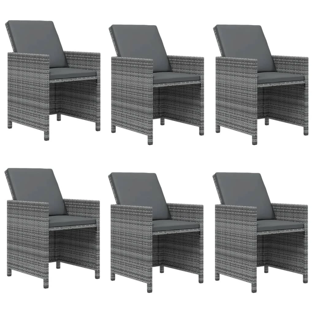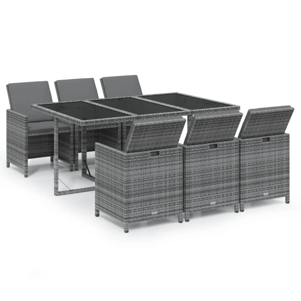 Este juego de comedor de jardín clásico, con un diseño elegante y contemporáneo, será una excelente opción para cenar o relajarse en el jardín. Apto para uso en exteriores: Hecho de ratán sintético resistente al agua y a la intemperie, este juego de comedor para jardín es fácil de limpiar, resistente y adecuado para usar a diario. Estructura robusta: Con una estructura de acero con recubrimiento en polvo, el juego de muebles de patio es robusto y duradero. Experiencia cómoda: El asiento y los cojines traseros gruesos, suaves y rellenos de espuma también añaden comodidad a los asientos. Diseño flexible: Puedes tirar del respaldo hacia abajo y almacenar las sillas debajo de la mesa, con el fin de ahorrar un valioso espacio de almacenamiento cuando no uses el conjunto. Gracias a la estructura ligera, todos los artículos son fáciles de mover. Nota:Para prolongar la vida de tus muebles de exterior, te recomendamos que los protejas con una funda impermeable. Color: GrisColor de cojín: Gris oscuroMaterial: Ratán PE, acero con recubrimiento en polvo, vidrio templadoMaterial del cojín: Tela (100% poliésterMaterial de relleno del cojín: EspumaDimensiones totales de la mesa: 163 x 107 x 74 cm (largo x ancho x altoDimensiones de la silla: 52 x 56 x 85 cm (ancho x profundo x altoDimensiones de asiento: 46 x 41 cm (ancho x profundoAltura del asiento desde el suelo: 45 cmAltura del reposabrazos desde el suelo: 64 cmDimensiones del cojín del asiento/respaldo: 46 x 41 x 5 cm (ancho x profundo x grosorRequiere montaje: SíLa entrega incluye:1 x Mesa con estructura extensible6 x Sillas6 x Cojines de asiento6 x Cojines de respaldo