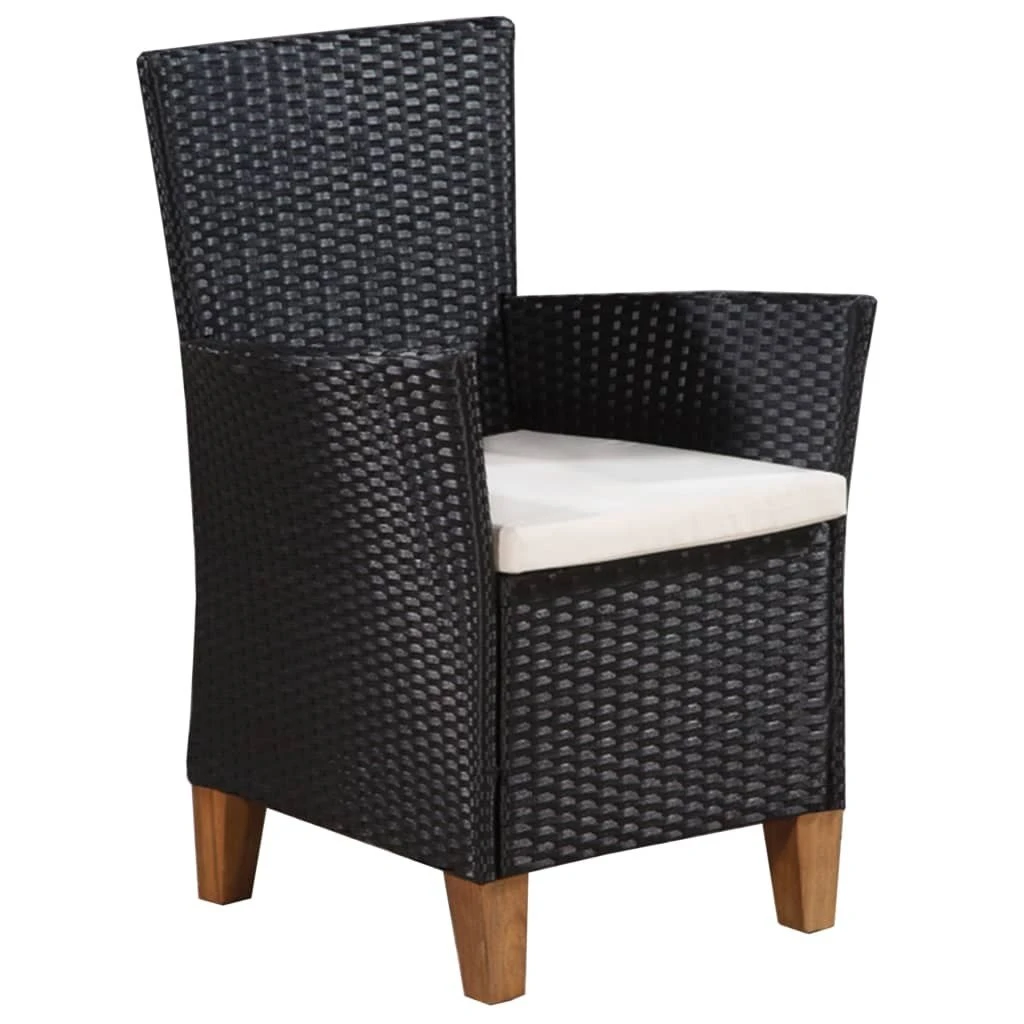 ¡Disfruta de una agradable comida al aire libre con tu familia y amigos con nuestro juego de comedor! La mesa de jardín está hecha de madera maciza de acacia con un acabado de aceite, lo que la hace robusta y duradera. Tiene un diseño atemporal y emana un encanto rústico. Gracias al ratán PE resistente al agua, los sillones son resistentes y fáciles de mantener. La estructura de acero y las patas de madera de acacia hacen que las sillas de jardín sean robustas y estables. Las sillas de comedor se entregan con cómodos cojines. Las fundas de cojín de poliéster apenas necesitan mantenimiento y se pueden quitar y lavar si es necesario. El conjunto de comedor es fácil de montar.Color: Negro y marrónColor de los cojines: Blanco cremaMaterial: Ratán PE (polietileno, acero con recubrimiento en polvo, madera maciza de acacia (con un acabado de aceite naturalMaterial de la funda de cojín: 100% poliésterDimensiones de la mesa: 85 x 85 x 74 cm (largo x ancho x altoDimensiones de la silla: 59 x 59 x 87,5 cm (ancho x profundo x altoAnchura del asiento: 41 cmProfundidad del asiento: 47 cmAltura del asiento desde el suelo: 42 cmAltura del reposabrazos desde el suelo: 63,5 cmGrosor del cojín: 4 cmRequiere montaje: SíLa entrega incluye:1 x Mesa4 x Sillas4 x Cojines de asiento