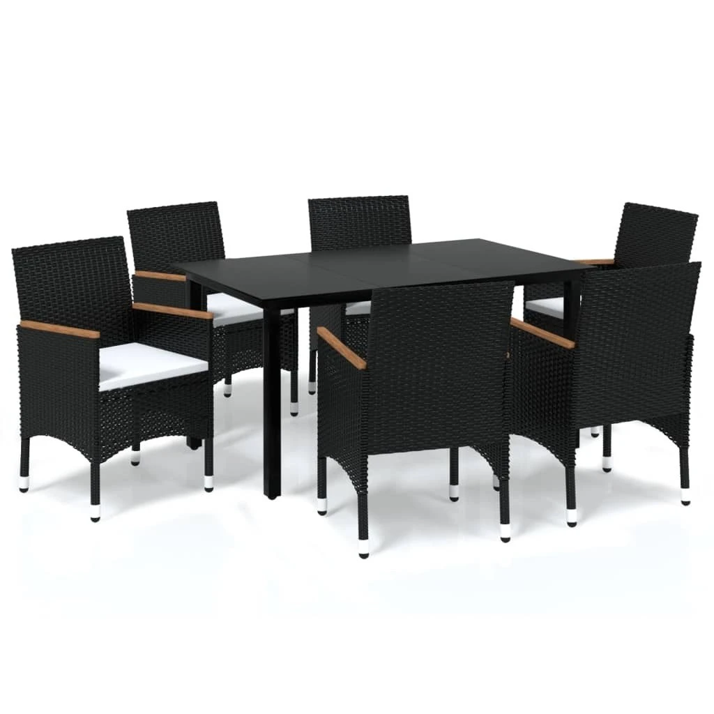 Este conjunto de comedor para jardín es la perfecta combinación de estilo y funcionalidad, y está destinado a ser el centro de atención de tu jardín, balcón o patio. Robusto estructura de acero envuelto con ratán de PE resistente a la intemperie, las sillas de jardín son a prueba de óxido y moho, proporcionando años de relajación de calidad. Los reposabrazos están bellamente decorados con madera maciza de acacia con un acabado de aceite natural, que aporta una sensación de encanto rústico. La mesa de exterior cuenta con una mesa de vidrio con líneas simples, que es fácil de limpiar y adecuada para uso en exteriores. El estructura de aluminio también garantiza estabilidad y robustez. Además, los cojines gruesamente acolchados proporcionan la máxima comodidad durante tu tiempo sentado. Este juego de comedor de patio es fácil de mover con la construcción ligera. Nota: Para prolongar la vida útil de los muebles de exterior, te recomendamos que los limpies con regularidad y no los dejes al aire libre sin protección innecesariamente.Limpiar: Usa una solución de jabón suaveAlmacenamiento: Si es posible, guarda el producto en un lugar fresco y seco en el interior. Si el producto se almacena al aire libre, protégelo con una funda impermeable. Limpia y seca el exceso de agua o nieve de las superficies planas después de una lluvia o nevada. Permite la ventilación para evitar daños relacionados con la humedad. MesaColor: NegroMaterial: Vidrio, aluminioDimensiones: 150 x 90 x 74 cm (largo x ancho x altoSillaColor del ratán sintético: NegroColor de los cojines: Blanco cremaMaterial: Ratán PE, acero, tejido (100% poliéster, madera de acacia maciza con acabado de aceite naturalDimensiones: 55 x 58 x 84 cm (ancho x profundo x altoDimensiones de asiento: 39/44,5 x 46 cm (ancho x profundoAltura del asiento desde el suelo: 42 cmAltura de reposabrazos desde el suelo: 62/65 cmGrosor de cojín del asiento: 4 cmRequiere montaje: SíLa entrega incluye:1 x Mesa6 x Sillas6 x Cojines de asiento
