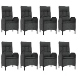 Este moderno juego de comedor de jardín, con un diseño elegante y contemporáneo, es una excelente opción para comer o relajarse en el jardín. Material resistente a la intemperie: El ratán PE, también conocido como ratán sintético, es resistente a la intemperie y fácil de limpiar. La parte exterior se mantiene hermosa durante mucho tiempo. Ofrece una gran calidad, comodidad y aspecto estético.Estructura robusta: Las estructuras de acero con recubrimiento en polvo hacen que el juego de comedor para exterior sea resistente y estable para usar a diario al aire libre.Superficie práctica: La superficie de madera maciza de acacia es perfecta para colocar bebidas, comida y adornos. Es bonita y fácil de limpiar.Función reclinable: Las sillas de jardín está especialmente diseñadas con una función reclinable para que puedas ajustar el respaldo según tu comodidad.Cómodo asiento: El respaldo añade un plus de comodidad al asiento de la silla de jardín. Además, los cojines gruesos y acolchados proporcionan comodidad al asiento. Información útil:Para facilitar al máximo el montaje, cada producto se entrega con un manual. Nota:Para asegurarte de que tus muebles de exterior se mantengan hermosos, recomendamos protegerlos con una funda impermeable. Color: NegroColor del cojín: NegroSilla reclinable de jardín:Material: Ratán PE, acero con recubrimiento en polvoMaterial de la funda del cojín: Tela (100% poliésterDimensiones: 57 x 62,5 x 109 cm (ancho x profundo x altoDimensiones del asiento: 50 x 47 cm (ancho x profundoAltura del asiento desde el suelo: 43 cmAltura del reposabrazos desde el suelo: 62 cmDimensiones del cojín de respaldo: 50 x 68 x 10 cm (ancho x profundo x grosorDimensiones del cojín de asiento: 50 x 47 x 3 cm (ancho x profundo x grosorRespaldo ajustableMesa:Material: Ratán PE, acero con recubrimiento en polvo, madera maciza de acacia con acabado de aceiteDimensiones: 190 x 90 x 75 cm (ancho x profundo x altoLa entrega incluye:8 x Sillas reclinables de jardín8 x Cojines de respaldo8 x Cojín de asiento1 x Mesa