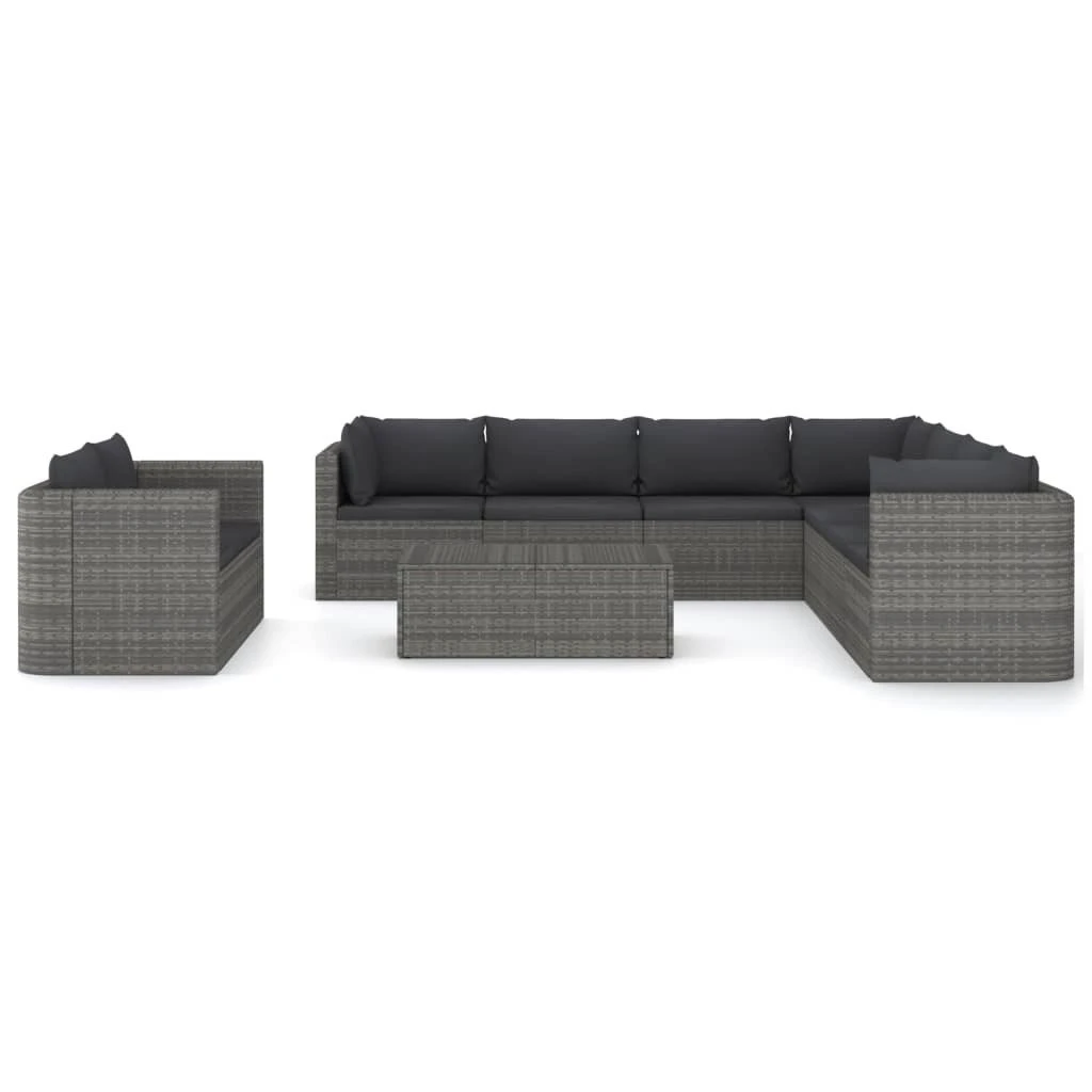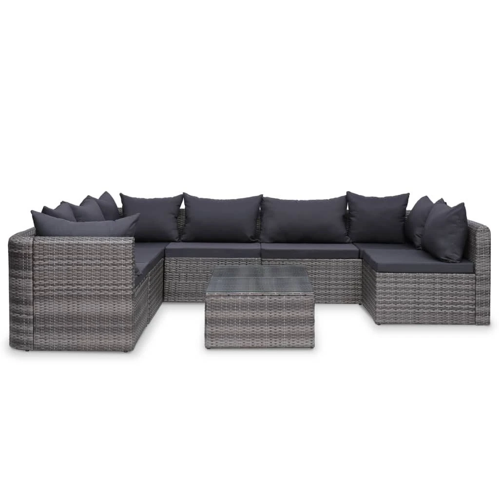 Este juego de muebles de jardín ofrece una generosa superficie de asiento y también resulta moderno con un toque de clase para tu jardín o patio. Gracias al ratán sintético impermeable, este juego de muebles de exterior es fácil de limpiar, resistente y adecuado para usar a diario al aire libre. Se entrega con cojines de asiento y almohadones de respaldo acolchados para el máximo confort, por lo que es un sofá tan cómodo como uno de interior. La funda de poliéster, que apenas necesita mantenimiento, se puede quitar y lavar. Este conjunto de muebles ofrece una flexibilidad total y se puede mover fácilmente para adaptarlo a cualquier disposición. Nota: Te recomendamos tapar el mueble en condiciones de lluvia, nieve y heladas. Color: GrisMaterial: Ratán sintético, acero con recubrimiento en polvo, vidrioMaterial de la funda de cojín y almohada: 100% poliésterSofá de esquina:Dimensiones: 72 x 72 x 63 cm (ancho x profundo x altoAnchura del asiento: 62 cmProfundidad del asiento: 62 cmAltura del asiento desde el suelo (sin cojín: 33 cmSofá central:Dimensiones: 68 x 72 x 63 cm (ancho x profundo x altoAnchura del asiento: 68 cmProfundidad del asiento: 62 cmAltura del asiento desde el suelo (sin cojín: 33 cmDimensiones de la mesa de centro: 100 x 60 x 33 cm (largo x ancho x altoGrosor del cojín: 6 cmGrosor de almohadas: 15 cmLa entrega incluye:5 x Sofá de esquina4 x Sofás centrales1 x Mesa de centro9 x Cojines de asiento12 x Almohadones de respaldo