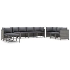 Crea un área de descanso relajante con este juego de muebles de jardín de ratán sintético. Este cómodo set de muebles de jardín, con una estructura de acero con recubrimiento en polvo recubierto con ratán PE, es robusto y fácil de limpiar. Los cojines bien acolchados añaden un plus de comodidad en tu tiempo de ocio. Las fundas de los cojines son extraíbles y lavables gracias a las cremalleras. Además, el reposapiés también sirve de mesita de centro para dejar lo que necesites. Este set de muebles de jardín es fácil de mover debido a su construcción ligera. Gracias al diseño modular, puedes colocar el conjunto en la disposición que prefieras. Nota importante: Recomendamos cubrir el set de salón en condiciones de lluvia, nieve y heladas para que sea más duradero. Color: GrisColor del cojín: Gris antracitaMaterial: Ratán PE (polietileno, acero con recubrimiento en polvo Material del cojín: Tela (100% poliésterMaterial de relleno del cojín del asiento: EspumaMaterial de relleno del cojín de respaldo: Fibra de algodónGrosor del cojín del asiento: 5 cmGrosor de cojín de respaldo: 15 cmSofá de esquina:Dimensiones: 60 x 60 x 60 cm (ancho x profundo x altoAnchura del asiento: 57 cmProfundidad del asiento: 57 cmAltura del asiento desde el suelo: 32 cmSofá central:Dimensiones: 54 x 60 x 60 cm (ancho x profundo x altoProfundidad del asiento: 57 cmAltura del asiento desde el suelo: 32 cmReposapiés:Dimensiones: 60 x 60 x 32 cm (ancho x profundo x altoRequiere montaje: SíLa entrega incluye:5 x Sofá de esquina3 x Sofás centrales2 x Taburetes/reposapiés10 x Cojines de asiento13 x Cojines de respaldo