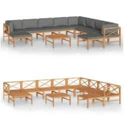 Este juego de jardín de madera, que destaca por su diseño elegante y sus cojines blandos, es un gran aporte para tu jardín, terraza o patio, para que puedas conversar con familiares y amigos o simplemente disfrutar del buen tiempo. Hecho de madera dura de teca muy duradera, este juego de muebles de teca ha sido curado, secado al horno y luego lijado para dar una apariencia muy suave. La madera de teca es conocida por su excepcional solidez y resistencia a la intemperie, lo que la hace mucho más adecuada para muebles de jardín que cualquier otro tipo de madera. La madera de teca es la elección perfecta si deseas comprar un mueble de jardín duradero. La superficie lijada es fácil de limpiar con un paño húmedo. El asiento y respaldo densamente acolchados, así como los reposapiés incluidos, aumentan la comodidad máxima. La mesa es ideal para colocar bebidas y comida. Nota: Para prolongar la vida útil de los muebles de exterior, te recomendamos que los limpies con regularidad y no los dejes al aire libre sin protección innecesariamente.Limpieza: Usa una solución de jabón suaveAlmacenamiento: Si es posible, guarda el producto en un lugar fresco y seco en el interior. Si el producto se almacena al aire libre, protégelo con una funda impermeable. Limpia y seca el exceso de agua o nieve de las superficies planas después de una lluvia o nevada. Permite la ventilación para evitar daños relacionados con la humedad. Color del cojín: GrisMaterial: Madera dura de teca lijada fina con acabado a base de agua, tela (100% poliésterDimensiones del sofá de la esquina: 66 x 66 x 60 cm (ancho x profundo x altoDimensiones del sofá del medio: 63 x 66 x 60 cm (ancho x profundo x altoDimensiones de la mesa: 63 x 63 x 30 cm (ancho x profundo x altoDimensiones del reposapiés : 62,5 x 62,5 x 30 cm (ancho x profundo x altoGrosor del cojín del asiento: 5 cmGrosor del cojín de respaldo: 15 cmRequiere montaje: SíLa entrega incluye:3 x Sofás de esquina5 x Sofás centrales1 x Mesa2 x Taburetes10 x Cojines de asiento11 x Cojines de respaldo