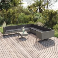 Crea un salón llamativo y relajante con el que siempre has soñado con este juego de salón de jardín. ¡Puedes disfrutar de una tarde soleada y relajante o una noche de verano con tu familia y amigos en este juego de muebles de jardín! Con el ratán PE resistente a la intemperie, este juego de salón para exterior es fácil de limpiar y mantener. La estructura de acero con recubrimiento en polvo hace que el juego de tumbonas sea estable y robusto. Equipado con cojines gruesos y suaves, este juego de tumbonas de jardín brindará la máxima comodidad para sentarse. Las fundas de poliéster fáciles de limpiar se pueden quitar y lavar. Además, gracias a su diseño ligero y modular, puedes mover este conjunto por tu casa con gran facilidad. Nota: Para prolongar la vida útil de los muebles de exterior, te recomendamos que los limpies con regularidad y no los dejes al aire libre sin protección innecesariamente.Limpieza: Usa una solución de jabón suaveAlmacenamiento: Si es posible, guarda el producto en un lugar fresco y seco en el interior. Si el producto se almacena al aire libre, protégelo con una funda impermeable. Limpia y seca el exceso de agua o nieve de las superficies planas después de una lluvia o nevada. Permite la ventilación para evitar daños relacionados con la humedad. Color: GrisColor de cojines: Gris antracitaMaterial: Ratán PE, acero con recubrimiento en polvo, tela (100% poliésterDimensiones del sofá central: 57 x 69 x 69 cm (ancho x profundo x altoDimensiones del sofá de esquina: 69 x 69 x 69 cm (ancho x profundo x altoDimensiones del reposapiés/mesa: 60 x 60 x 35 cm (largo x ancho x altoAnchura del asiento: 57 cmProfundidad del asiento: 57 cmAltura del asiento desde el suelo: 35 cmRequiere montaje: SíLa entrega incluye:6 x Sofás centrales4 x Sofás de esquina1 x Reposapiés/Mesa11 x Cojines de asiento14 x Cojín de respaldo