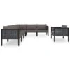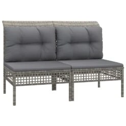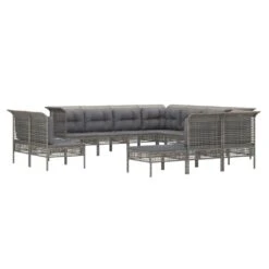 ¡Disfruta de un agradable café en el espacio al aire libre de la casa con este juego de muebles para jardín! Es un aporte perfecto para el jardín y la terraza, y crea además una impresión duradera. Material resistente a la intemperie: El ratán sintético es resistente a la intemperie y fácil de limpiar. La parte exterior se mantiene hermosa durante mucho tiempo. Es más económico que otros materiales, además de ofrecer una gran calidad, comodidad y aspecto estético.Estructura robusta y estable: La estructura de acero del conjunto de muebles garantiza su solidez y estabilidad.Cómodo asiento: El respaldo aporta un plus de comodidad al juego de muebles. Además, los cojines gruesos y acolchados proporcionan comodidad al asiento.Diseño modular: El juego de muebles de jardín es flexible y fácil de mover, por lo que puedes combinarlo con otros segmentos modulares de la tienda web para crear tus propias configuraciones personales de juegos de muebles para jardín. Nota:Para asegurarte de que tus muebles de exterior se mantengan hermosos, recomendamos protegerlos con una funda impermeable. Color: GrisColor de cojín: Gris oscuroMaterial: Ratán sintético, acero con recubrimiento en polvoSofá central:Dimensiones: 55 x 65 x 75 cm (ancho x profundo x altoAnchura del asiento: 55 cmProfundidad del asiento: 55 cmAltura del asiento desde el suelo: 32 cmDiseño de cuadrículaCapacidad de carga máxima: 110 kgSofá esquinero:Dimensiones: 65 x 65 x 75 cm (ancho x profundo x altoAnchura del asiento: 55 cmProfundidad del asiento: 55 cmAltura del asiento desde el suelo: 32 cmDiseño de cuadrículaCapacidad de carga máxima: 110 kgReposapiés: Dimensiones: 55 x 55 x 32 cm (ancho x profundo x altoDiseño de cuadrículaCapacidad de carga máxima: 110 kgCojín:Material: Tela (100% poliésterMaterial del relleno del cojín de asiento: EspumaMaterial del relleno del cojín de respaldo: Fibra de algodónDimensiones del cojín de asiento: 55 x 55 x 3 cm (ancho x profundo x grosorDimensiones del cojín de respaldo: 48 x 39 x 10 cm (ancho x profundo x grosor / 56 x 39 x 10 cm (ancho x profundo x grosorRequiere montaje: SíLa entrega incluye: 7 x Sofás centrales4 x Sofás de esquina1 x Reposapiés12 x Cojines de asiento15 x Cojines de respaldo