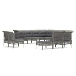 ¡Disfruta de un agradable café en el espacio al aire libre de la casa con este juego de muebles para jardín! Es un aporte perfecto para el jardín y la terraza, y crea además una impresión duradera. Material resistente a la intemperie: El ratán sintético es resistente a la intemperie y fácil de limpiar. La parte exterior se mantiene hermosa durante mucho tiempo. Es más económico que otros materiales, además de ofrecer una gran calidad, comodidad y aspecto estético.Estructura robusta y estable: La estructura de acero del conjunto de muebles garantiza su solidez y estabilidad.Cómodo asiento: El respaldo aporta un plus de comodidad al juego de muebles. Además, los cojines gruesos y acolchados proporcionan comodidad al asiento.Diseño modular: El juego de muebles de jardín es flexible y fácil de mover, por lo que puedes combinarlo con otros segmentos modulares de la tienda web para crear tus propias configuraciones personales de juegos de muebles para jardín. Nota:Para asegurarte de que tus muebles de exterior se mantengan hermosos, recomendamos protegerlos con una funda impermeable. Color: GrisColor de cojín: Gris oscuroMaterial: Ratán sintético, acero con recubrimiento en polvoSofá central:Dimensiones: 55 x 65 x 75 cm (ancho x profundo x altoAnchura del asiento: 55 cmProfundidad del asiento: 55 cmAltura del asiento desde el suelo: 32 cmDiseño de cuadrículaCapacidad de carga máxima: 110 kgSofá esquinero:Dimensiones: 65 x 65 x 75 cm (ancho x profundo x altoAnchura del asiento: 55 cmProfundidad del asiento: 55 cmAltura del asiento desde el suelo: 32 cmDiseño de cuadrículaCapacidad de carga máxima: 110 kgReposapiés: Dimensiones: 55 x 55 x 32 cm (ancho x profundo x altoDiseño de cuadrículaCapacidad de carga máxima: 110 kgCojín:Material: Tela (100% poliésterMaterial del relleno del cojín de asiento: EspumaMaterial del relleno del cojín de respaldo: Fibra de algodónDimensiones del cojín de asiento: 55 x 55 x 3 cm (ancho x profundo x grosorDimensiones del cojín de respaldo: 48 x 39 x 10 cm (ancho x profundo x grosor / 56 x 39 x 10 cm (ancho x profundo x grosorRequiere montaje: SíLa entrega incluye: 7 x Sofás centrales4 x Sofás de esquina1 x Reposapiés12 x Cojines de asiento15 x Cojines de respaldo