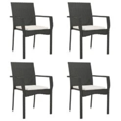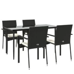Este moderno juego de comedor de jardín, con un diseño elegante y contemporáneo, es una excelente opción para comer o relajarse en el jardín. Material resistente a la intemperie: El ratán PE, también conocido como ratán sintético, es resistente a la intemperie y fácil de limpiar. La parte exterior se mantiene hermosa durante mucho tiempo. Ofrece una gran calidad, comodidad y aspecto estético.Estructura robusta: Las estructuras de acero con recubrimiento en polvo hacen que el juego de comedor para exterior sea resistente y estable para usar a diario al aire libre.Superficie práctica: La superficie de madera maciza de acacia es perfecta para colocar bebidas, comida y adornos. Es bonita y fácil de limpiar.Diseño modular: El juego de comedor para patio es flexible y fácil de mover, por lo que puedes combinarlo con otros segmentos modulares de la web para crear tus propias configuraciones personales de muebles de comedor para jardín.Cómodo asiento: El respaldo añade un plus de comodidad al asiento de la silla de jardín. Además, los cojines gruesos y acolchados proporcionan comodidad al asiento. Información útil:Para facilitar al máximo el montaje, cada producto se entrega con un manual. Nota:Para asegurarte de que tus muebles de exterior se mantengan hermosos, recomendamos protegerlos con una funda impermeable. Color: NegroColor de cojines: Blanco cremaSilla de jardín:Material: Ratán PE, acero con recubrimiento en polvoMaterial de la funda del cojín: Tela (100% poliésterDimensiones: 59 x 53,5 x 88 cm (ancho x profundo x altoDimensiones de asiento: 43 x 43 cm (ancho x profundoAltura del asiento desde el suelo: 44 cmAltura del apoyabrazos desde el suelo: 64,5 cmAnchura del reposabrazos: 6 cmDimensiones del cojín de asiento: 40 x 43 x 3 cm (ancho x profundo x grosorMesa:Material: Acero con recubrimiento en polvo, madera maciza de acacia con acabado de aceiteDimensiones: 140 x 70 x 74 cm (largo x ancho x altoLa entrega incluye:4 x Sillas de jardín4 x Cojines de asiento1 x Mesa