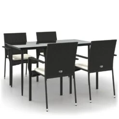 Este moderno juego de comedor de jardín, con un diseño elegante y contemporáneo, es una excelente opción para comer o relajarse en el jardín. Material resistente a la intemperie: El ratán PE, también conocido como ratán sintético, es resistente a la intemperie y fácil de limpiar. La parte exterior se mantiene hermosa durante mucho tiempo. Ofrece una gran calidad, comodidad y aspecto estético.Estructura robusta: Las estructuras de acero con recubrimiento en polvo hacen que el juego de comedor para exterior sea resistente y estable para usar a diario al aire libre.Superficie práctica: La superficie de madera maciza de acacia es perfecta para colocar bebidas, comida y adornos. Es bonita y fácil de limpiar.Diseño modular: El juego de comedor para patio es flexible y fácil de mover, por lo que puedes combinarlo con otros segmentos modulares de la web para crear tus propias configuraciones personales de muebles de comedor para jardín.Cómodo asiento: El respaldo añade un plus de comodidad al asiento de la silla de jardín. Además, los cojines gruesos y acolchados proporcionan comodidad al asiento. Información útil:Para facilitar al máximo el montaje, cada producto se entrega con un manual. Nota:Para asegurarte de que tus muebles de exterior se mantengan hermosos, recomendamos protegerlos con una funda impermeable. Color: NegroColor de cojines: Blanco cremaSilla de jardín:Material: Ratán PE, acero con recubrimiento en polvoMaterial de la funda del cojín: Tela (100% poliésterDimensiones: 59 x 53,5 x 88 cm (ancho x profundo x altoDimensiones de asiento: 43 x 43 cm (ancho x profundoAltura del asiento desde el suelo: 44 cmAltura del apoyabrazos desde el suelo: 64,5 cmAnchura del reposabrazos: 6 cmDimensiones del cojín de asiento: 40 x 43 x 3 cm (ancho x profundo x grosorMesa:Material: Acero con recubrimiento en polvo, madera maciza de acacia con acabado de aceiteDimensiones: 140 x 70 x 74 cm (largo x ancho x altoLa entrega incluye:4 x Sillas de jardín4 x Cojines de asiento1 x Mesa