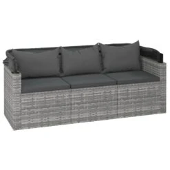 Este cómodo conjunto de sofás para jardín es una combinación perfecta de estilo y funcionalidad. Material duradero: El ratán PE, también conocido como ratán sintético, es resistente a la intemperie y fácil de limpiar. La parte exterior se mantiene hermosa durante mucho tiempo. Es más económico que otros materiales, además de ofrecer una gran calidad, comodidad y aspecto estético.Toldo plegable: Puedes regular el toldo con facilidad para satisfacer tus necesidades. Cierra el toldo para tomar el sol y ábrelo para relajarte a la sombra. Bloquea los nocivos rayos UV de forma eficaz y protege la piel de las quemaduras solares.Estructura estable: Las estructuras de acero con recubrimiento en polvo del juego de sofás para exterior garantizan la solidez y estabilidad.Práctico reposapiés: El taburete sirve para descansar los pies cuando te recuestas en el sofá y te ofrece un asiento adicional.Cómodo asiento: El juego de sofás de ratán sintético resulta muy cómodo gracias al asiento y al respaldo con acolchado grueso. Información útil:Para facilitar al máximo el montaje, cada producto se entrega con un manual. Nota:Para asegurarte de que tus muebles de exterior se mantengan hermosos, recomendamos protegerlos con una funda impermeable. Sofá de 3 plazas:Color: GrisMaterial: Ratán PE, acero con recubrimiento en polvoDimensiones: 178 x 64 x 151,5 cm (ancho x profundo x altoDimensiones del asiento: 160 x 62 cm (ancho x profundoAltura del asiento desde el suelo: 36 cmAnchura del reposabrazos: 8 cmAltura del reposabrazos desde el suelo: 55 cmCapacidad máxima de carga: 110 kgSofá central:Color: GrisMaterial: Ratán PE, acero con recubrimiento en polvoDimensiones: 54 x 63 x 60,5 cm (ancho x profundo x altoDimensiones de asiento: 53,5 x 53 cm (ancho x profundoAltura del asiento desde el suelo: 36 cmCapacidad máxima de carga: 110 kgReposapiés:Color: GrisMaterial: Ratán PE, acero con recubrimiento en polvoDimensiones: 53,5 x 53,5 x 36 cm (largo x ancho x altoCojín:Color: Gris oscuroMaterial de la cubierta: Tela (100% poliésterMaterial de relleno: Espuma, algodón PPDimensiones del cojín de asiento (sofá de 3 plazas: 62 x 52 cm (ancho x profundoDimensiones del cojín de asiento (sofá central: 53,5 x 53 cm (ancho x profundoDimensiones del cojín de respaldo (sofá de 3 plazas: 52 x 38 cm (ancho x profundoDimensiones del cojín de respaldo (sofá central: 56 x 39 cm (ancho x profundoDimensiones del cojín del reposapiés: 54 x 54 cm (ancho x profundoGrosor del cojín de asiento: 3,5 cmLa entrega incluye:1 x Sofá de 3 plazas2 x Sofás centrales1 x Reposapiés5 x Cojines de asiento5 x Cojines de respaldo1 x Cojín de taburete
