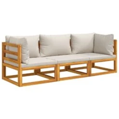 ¡Disfruta de una taza de café o té con un tiempo agradable en el espacio al aire libre de la casa con este elegante juego de muebles de jardín de madera! Madera maciza de acacia: Este juego de muebles de jardín está hecho de madera maciza de acacia. La madera maciza de acacia es un bonito material natural. La madera de acacia es una madera dura tropical, densa, robusta y duradera.Cómodo asiento: El respaldo añade un plus de comodidad al sofá. Además, los cojines gruesos y acolchados proporcionan comodidad al asiento.Diseño modular: El juego de sofás de jardín es flexible y fácil de mover, por lo que puedes combinarlo con otros segmentos modulares de la tienda web para crear tus propias configuraciones personales de juegos de muebles para jardín. Información útil:Para facilitar al máximo el montaje, cada producto se entrega con un manual. Nota:Para asegurarte de que tus muebles de exterior se mantengan hermosos, recomendamos protegerlos con una funda impermeable. Material de la silla: Madera maciza de acacia con un acabado de aceiteSofá esquinero:Dimensiones: 70,5 x 70,5 x 65 cm (ancho x profundo x altoAltura del asiento desde el suelo (sin cojín: 29 cmCapacidad de carga máxima: 110 kgSofá central:Dimensiones: 68 x 70,5 x 65 cm (ancho x profundo x altoAltura del asiento desde el suelo (sin cojín: 29 cmCapacidad de carga máxima: 110 kgCojín:Color del cojín: Gris claroMaterial de la funda del cojín: Tela (100% poliésterMaterial de relleno: Espuma, fibra de algodónDimensiones del cojín de asiento: 68 x 68 x 6 cm (ancho x profundo x altoDimensiones del cojín de respaldo (grande: 68 x 45 x 15 cm (ancho x profundo x altoDimensiones del cojín de respaldo (pequeño: 58 x 45 x 15 cm (ancho x profundo x altoLa entrega incluye:2 x Sofás esquineros1 x Sofá central3 x Cojines de asiento3 x Cojines de respaldo (grande2 x Cojines de respaldo (pequeño