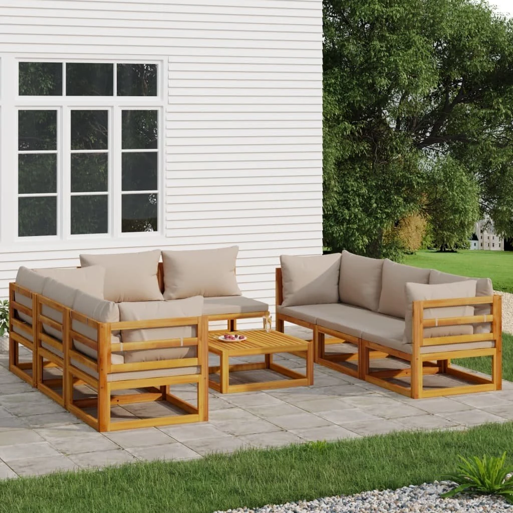 ¡Disfruta de una taza de café o té con un tiempo agradable en el espacio al aire libre de la casa con este elegante juego de muebles de jardín de madera! Madera maciza de acacia: Este juego de muebles de jardín está hecho de madera maciza de acacia. La madera maciza de acacia es un bonito material natural. La madera de acacia es una madera dura tropical, densa, robusta y duradera.Cómodo asiento: El respaldo añade un plus de comodidad al sofá. Además, los cojines gruesos y acolchados proporcionan comodidad al asiento.Mesa práctica: La mesa resistente es perfecta para colocar comidas, bebidas y otros artículos decorativos.Diseño modular: El juego de sofás de jardín es flexible y fácil de mover, por lo que puedes combinarlo con otros segmentos modulares de la tienda web para crear tus propias configuraciones personales de juegos de muebles para jardín. Información útil:Para facilitar al máximo el montaje, cada producto se entrega con un manual. Nota:Para asegurarte de que tus muebles de exterior se mantengan hermosos, recomendamos protegerlos con una funda impermeable. Material de la silla: Madera maciza de acacia con un acabado de aceiteMesa:Dimensiones: 68 x 68 x 29 cm (ancho x profundo x altoSofá esquinero:Dimensiones: 70,5 x 70,5 x 65 cm (ancho x profundo x altoAltura del asiento desde el suelo (sin cojín: 29 cmCapacidad de carga máxima: 110 kgSofá central:Dimensiones: 68 x 70,5 x 65 cm (ancho x profundo x altoAltura del asiento desde el suelo (sin cojín: 29 cmCapacidad de carga máxima: 110 kgCojín:Color del cojín: Gris taupéMaterial de la funda del cojín: Tela (100% poliésterMaterial de relleno: Espuma, fibra de algodónDimensiones del cojín de asiento: 68 x 68 x 6 cm (ancho x profundo x altoDimensiones del cojín de respaldo (grande: 68 x 45 x 15 cm (ancho x profundo x altoDimensiones del cojín de respaldo (pequeño: 58 x 45 x 15 cm (ancho x profundo x altoLa entrega incluye:4 x Sofás de esquina4 x Sofás centrales1 x Mesa de centro8 x Cojín de asiento8 x Cojines de respaldo (grandes4 x Cojines de respaldo (pequeño