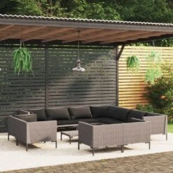 ¡Relájate y disfruta del espacio al aire libre de tu casa con este clásico juego de muebles para jardín! Estructura robusta: Con una estructura de acero con recubrimiento en polvo, el juego de muebles de patio es robusto y duradero.Construcción ligera: La construcción ligera hace que el juego de sofás sea fácil de mover.Material de primera calidad: Hecho de ratán PE semicircular, este juego de muebles para exteriores es resistente a la intemperie y al agua, fácil de limpiar y mantener.Cómodos cojines y almohadas: Los cojines y las almohadas acolchados gruesos y extraíbles brindan una comodidad óptima para que te sientes al aire libre. Nota:Recomendamos cubrir el conjunto de jardín en caso de lluvia, nieve y heladas para que dure más tiempo. Además, te recomendamos limpiarlo regularmente para alargar la vida de los muebles de exterior. No lo dejes al aire libre sin protección innecesariamente.Limpieza: Usa una solución de jabón suaveAlmacenamiento: Si es posible, guárdala en un lugar fresco y seco en el interior. Si el producto se almacena en el exterior, protégelo con una cubierta impermeable. Limpia y seca el exceso de agua o nieve de las superficies planas después de una lluvia o nevada. Permite la ventilación para evitar daños relacionados con la humedad. Color del ratán: Gris oscuroColor del cojín: NegroMaterial: Acero con recubrimiento en polvo, ratán PE semicircular, tablero de PC, tela (100 % poliésterMaterial de relleno: EspumaSofá central:Dimensiones: 70 x 70 x 61 cm (ancho x profundo x altoDimensiones de asiento: 70 x 60 cm (ancho x profundoAltura del asiento desde el suelo: 21 cmDimensiones del cojín del asiento: 68 x 58 cm (ancho x profundoDimensiones del cojín del respaldo: 68 x 37 cm (ancho x altoSofá esquinero:Dimensiones: 70 x 70 x 61 cm (ancho x profundo x altoDimensiones del asiento: 60 x 60 cm (ancho x profundoAltura del asiento desde el suelo: 21 cmDimensiones del cojín del asiento: 58 x 58 cm (ancho x profundoDimensiones del cojín del respaldo: 50/59 x 37 cm (ancho x altoMesa de centro:Dimensiones: 120 x 55 x 21 cm (largo x ancho x altoRequiere montaje: SíLa entrega contiene:7 x Sofá de esquína2 x Sofás centrales1 x Mesa de centro11 x Cojines de asiento18 x Cojines de respaldo