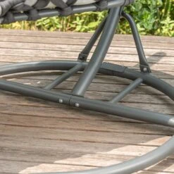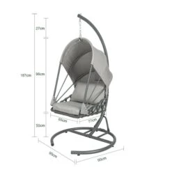 Material: Estructura de hierro resistente e inoxidable. Cojín en tejido oxford y espuma. Dimensiones de la silla (An x Pr x Al: 95 x 95 x 187 cm. Altura del asiento: 50 cm. Capacidad máxima de carga: 120 kg.El soporte adopta un diseño en forma de C para garantizar una buena estabilidad y seguridad. El respaldo y los cojines son todos desenfundables y lavables. Cada anillo se puede quitar o colgar para ajustar la altura según sus necesidades.El respaldo ergonómico, los cojines cómodos, todo esto asegura una comodidad adicional al sentarse. La superficie del cojín está hecha de tela oxford, alta solidez del color, puede soportar la luz del sol, la lluvia y no se desvanece fácilmente.Ideal para espacios exteriores como jardines, terrazas, balcones o patios, crea tu propio pequeño refugio para relajarte. Estilo contemporáneo arqueado de gran elegancia.Con instrucciones de montaje ilustradas y piezas numeradas, el montaje es fácil.