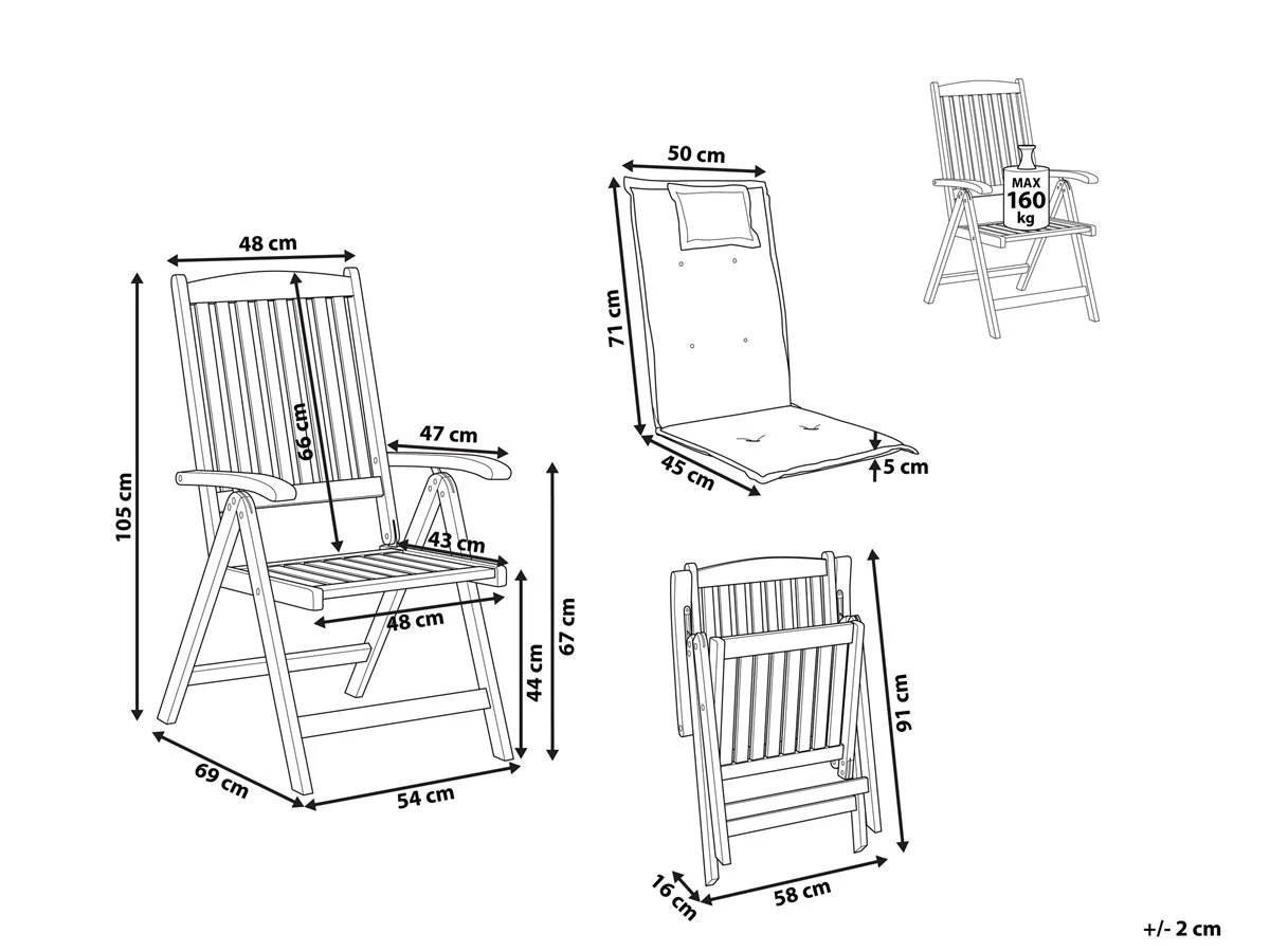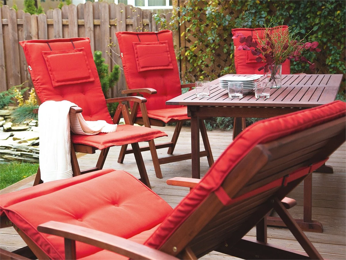 Silla de jardín con cojín. Este tipo de madera es extremadamente resistente. Haga sol, frío o llueva la madera se mantiene igual sin necesidad de cuidados especiales. La madera de acacia es muy dura. La silla de forma ergonómica ha sido equipada con un ajuste de respaldo de cinco niveles, lo que permite relajarse completamente. Además, la silla es plegable, y de esta manera puedes ahorrar mucho espacio mientras no la uses. El cojín es muy cómodo y grueso, fácil de limpiar, hecho de impermeable y resistente a los rayos UV. Detalles: Tipo de Producto: Silla de jardín Estilo: Rústico Color: Rojo Tonalidad: Rojo claro Tipo de material: Madera maciza Material principal: Madera de acacia Material adicional: Acero Material de las patas: Madera maciza Material del asiento: Tejido Composición del Material: 100% Poliéster Apoyabrazo: Sí Acabado: Aceitado Plegable: Sí Apilable: No Dimensiones: Altura del apoyabrazos: 67 cm Profundidad: 69 cm Espesor del asiento: 5 cm Altura del asiento: 44 cm Ancho: 54 cm Altura: 105 cm Superficie del asiento: 48×43 cm Peso: 11 kg Capacidad de peso: 112 kg La oferta incluye: 1 x Silla, 1 x Cojín Ventajas: Las tiras ofrecen una fijación segura, Extremadamente cómodo, Cómodos apoyabrazos, Diseño clásico, Materiales reciclables y ecológicos, Materiales pensados para el uso en el exterior, Resistencia UV 4 (ISO 105-B02, Plegable, ahorra espacio Información de montaje: No requiere montaje Información adicional: Por favor, ten en cuenta que la madera es un producto natural, y cada pieza puede presentar ligeras variaciones. Las diferencias en el color o la textura, como las arrugas u otras características naturales, no se consideran un defecto ni tampoco una base de reclamación, El producto viene con un libro de cuidados detallado para ayudarte a mantener tus muebles en las mejores condiciones durante muchos años. Consulta estos consejos para garantizar el mantenimiento adecuado de tus muebles nuevos – encontrarás las instrucciones de mantenimiento junto con el manual de montaje. Texto de resistencia: Gracias a su resistencia al agua, puedes utilizar el producto al aire libre y dejarlo a la intemperie durante lluvias ligeras. Si no es posible guardarlo en un lugar cerrado y protegido, recomendamos utilizar una funda protectora. La exposición prolongada a la humedad puede provocar daños en el mueble. Resistencia: Agua ligera / humedad Consejos de mantenimiento: Madera de acacia: 1.Limpiar con un limpiador suave y un paño suave en la dirección de la veta. Secar con un paño inmediatamente después de limpiar 2.Durante el invierno o en condiciones climáticas adversas, utilice una funda protectora o guarde los muebles en el interior 3.Los muebles con acabado de aceite deben volverse a engrasar antes de ponerlos en uso y al menos una vez al año, especialmente en el clima húmedo. Poliéster: 1.Cuando no esté en uso, manténgalo en un lugar limpio y seco para protegerlo de las condiciones atmosféricas 2.Aspire con un accesorio adecuado 3.Limpiar con champú seco y una esponja húmeda o un limpiador suave.