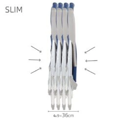 Esta silla de playa Aktive Beach ha sido diseñada para relajarse durante horas en la playa y ocupar el mínimo espacio cuando está plegada, ya que su característica principal es el plegado Slim. Está fabricada con estructura de aluminio plateada (soporta hasta 110 kg, su tejido es textileno reforzado color azul marino y los reposabrazos ergonómicos son de plástico resistente color gris. La silla ofrece gran comodidad gracias al respaldo multiposición fácil de regular con los reposabrazos (6 posiciones y a la ausencia de tubo delantero en las piernas. Las patas llevan incorporados topes antivuelco para más estabilidad y seguridad durante su uso y cuenta con costuras termoselladas en respaldo y asiento para mayor resistencia y durabilidad. Gracias a su plegado extraplano, a su peso ligero y a las asas de mano incorporadas, es muy fácil de transportar, almacenar y apilar.