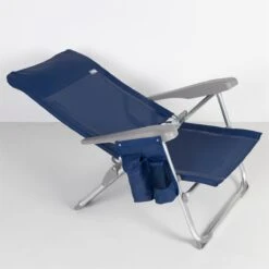 Esta silla de playa Aktive Beach ha sido diseñada para relajarse durante horas en la playa y ocupar el mínimo espacio cuando está plegada, ya que su característica principal es el plegado Slim. Está fabricada con estructura de aluminio plateada (soporta hasta 110 kg, su tejido es textileno reforzado color azul marino y los reposabrazos ergonómicos son de plástico resistente color gris. La silla ofrece gran comodidad gracias a su cojín acolchado, al respaldo multiposición fácil de regular con los reposabrazos (6 posiciones, a la ausencia de tubo delantero en las piernas y al bolsillo lateral con dos compartimentos. Las patas llevan incorporados topes antivuelco para más estabilidad y seguridad durante su uso y cuenta con costuras termoselladas en respaldo y asiento para mayor resistencia y durabilidad. Gracias a su plegado extraplano, a su peso ligero y a las asas de mano incorporadas, es muy fácil de transportar, almacenar y apilar.