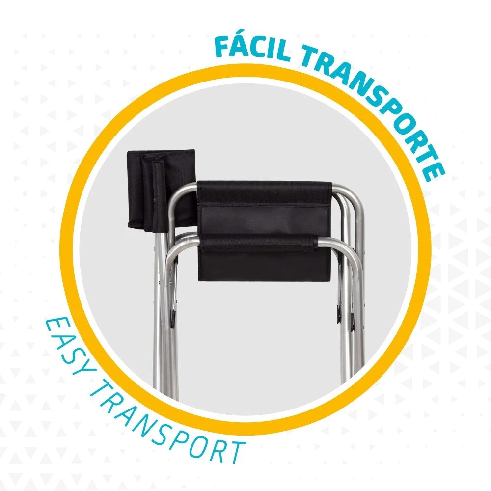 Silla tipo director plegable Aktive Beach de 51 x 45 x 81 cm. El asiento mide 45 cm de alto y la distancia entre reposabrazos es de 56 cm de ancho. Asiento de material Oxford negro. Cuenta con almohadilla protectora en los reposabrazos y estructura de aluminio con tubos de 2 cm de grosor. Patas con tacos antideslizantes de goma para mayor estabilidad. Soporta hasta 100 kg. Ideal para playa, camping o asiento extra.