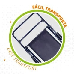 - Con posición fija, reposabrazos de PVC, se pliega por completo tipo tijera (medidas plegada: 53×77 cm