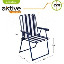 Silla de playa plegable marinera Aktive Beach. Con estructura de acero tubular de 1,8 cm de grosor cromada en azul marino y asiento de terileno de secado rápido, transpirable, flexible y cómodo. Mide 53 x 47 x 85 cm y cuenta con respaldo, reposabrazos de PVC azul y tacos antideslizantes y antivuelcos en las patas. La altura del asiento es de 38 cm y plegada mide 53 x 77 cm. Soporta 100 kg. Silla fija ideal para la playa, la terraza o el jardín.