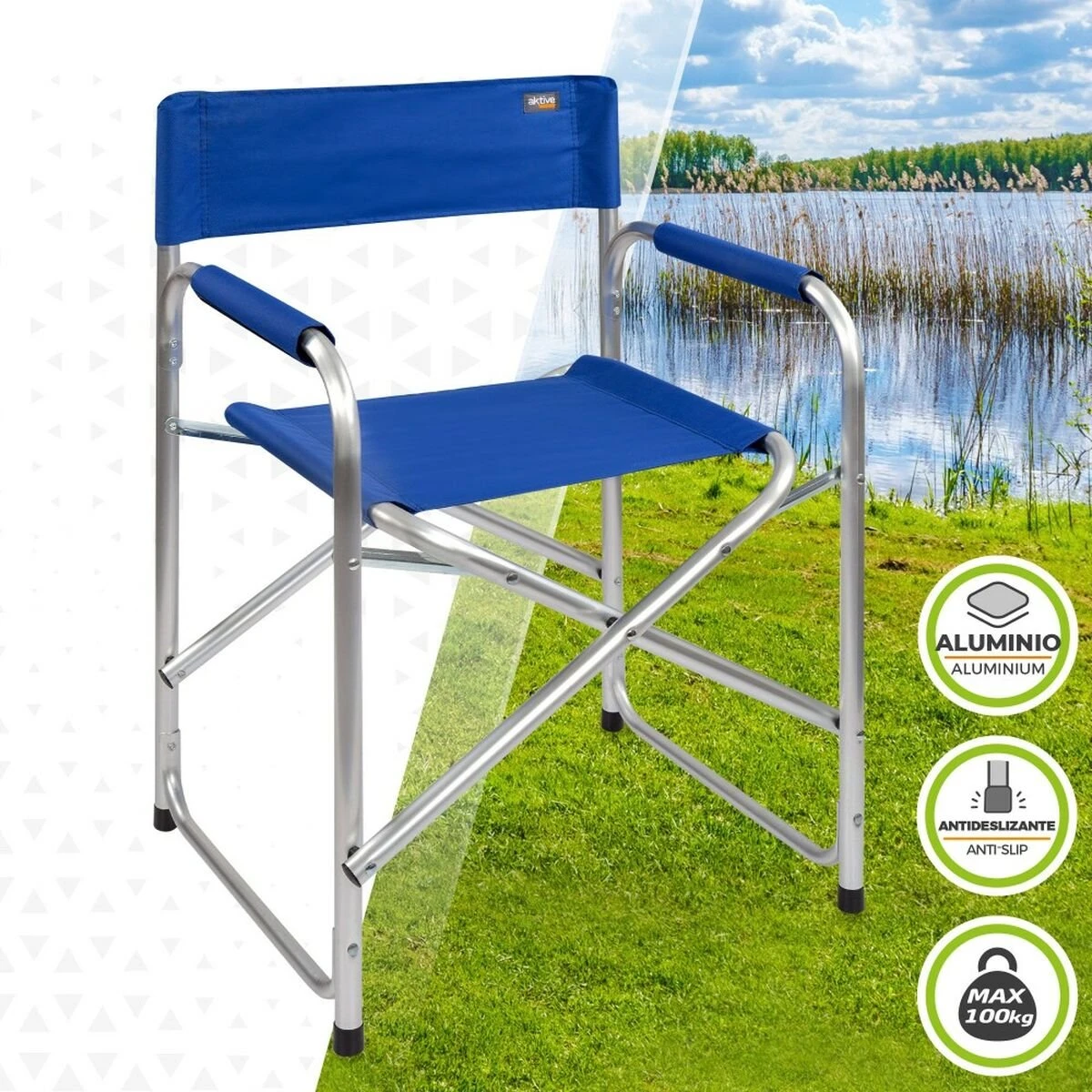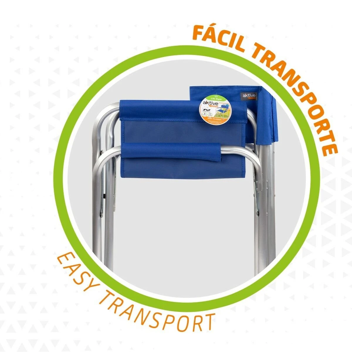 Silla plegable estilo director de Aktive, con medidas desplegada de 56x49x78 cm, altura del suelo de 45 cm y distancia entre los reposabrazos de 56 cm. La silla mide desplegada 49×78 cm. Su asiento, respaldo y reposabrazos con almohadilla están fabricados con tela Oxford 600D en color azul. Cuenta con estructura de aluminio que soporta hasta 100 kg de peso y con tacos antideslizantes en las patas. Se pliega en un solo movimiento para transportarla cómodamente y guardarla sin apenas ocupar espacio. ¡Disfruta como nunca de tus momentos al aire libre con Aktive!