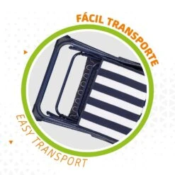 - Tiene 5 posiciones que se regulan a través de los reposabrazos, diseño marinero a rayas blancas y azules, se pliega por completo (medidas: 59×97